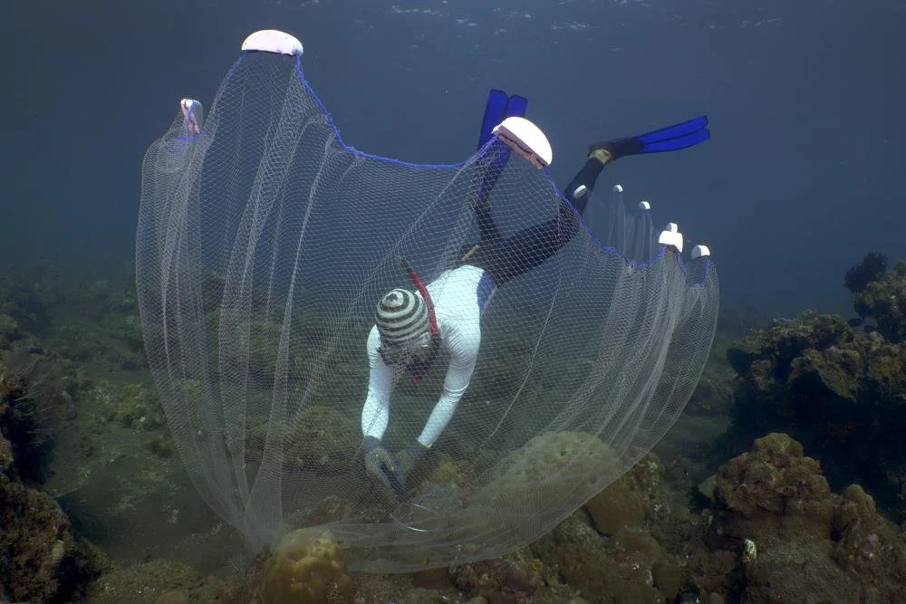 Made Partiana uses a net to catch aquarium fish on north coast of Bali, Indonesia, on April 10, 2021. Millions of saltwater fish are caught in Indonesia and other countries every year to fill ever more elaborate aquariums in living rooms, waiting rooms and restaurants around the world with vivid, otherworldly life. (AP Photo/Alex Lindbloom)